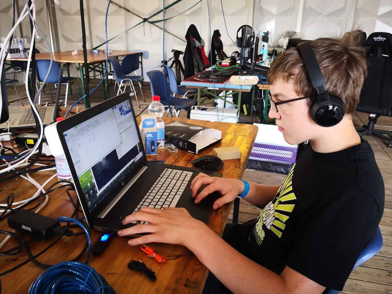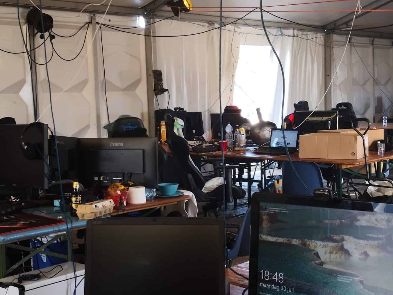 Naar Noord-Limburg dus, waar een veld waar normaal gesproken paarden lopen, omgebouwd is tot een paradijs voor gamers. Sneller internet dan thuis, voldoende stroom en andere basale voorzieningen zoals toiletten en douches en zelfs een zwemplek om af te koelen. Maar het belangrijkste zijn de vele tenten waarin gamers kunnen zitten.