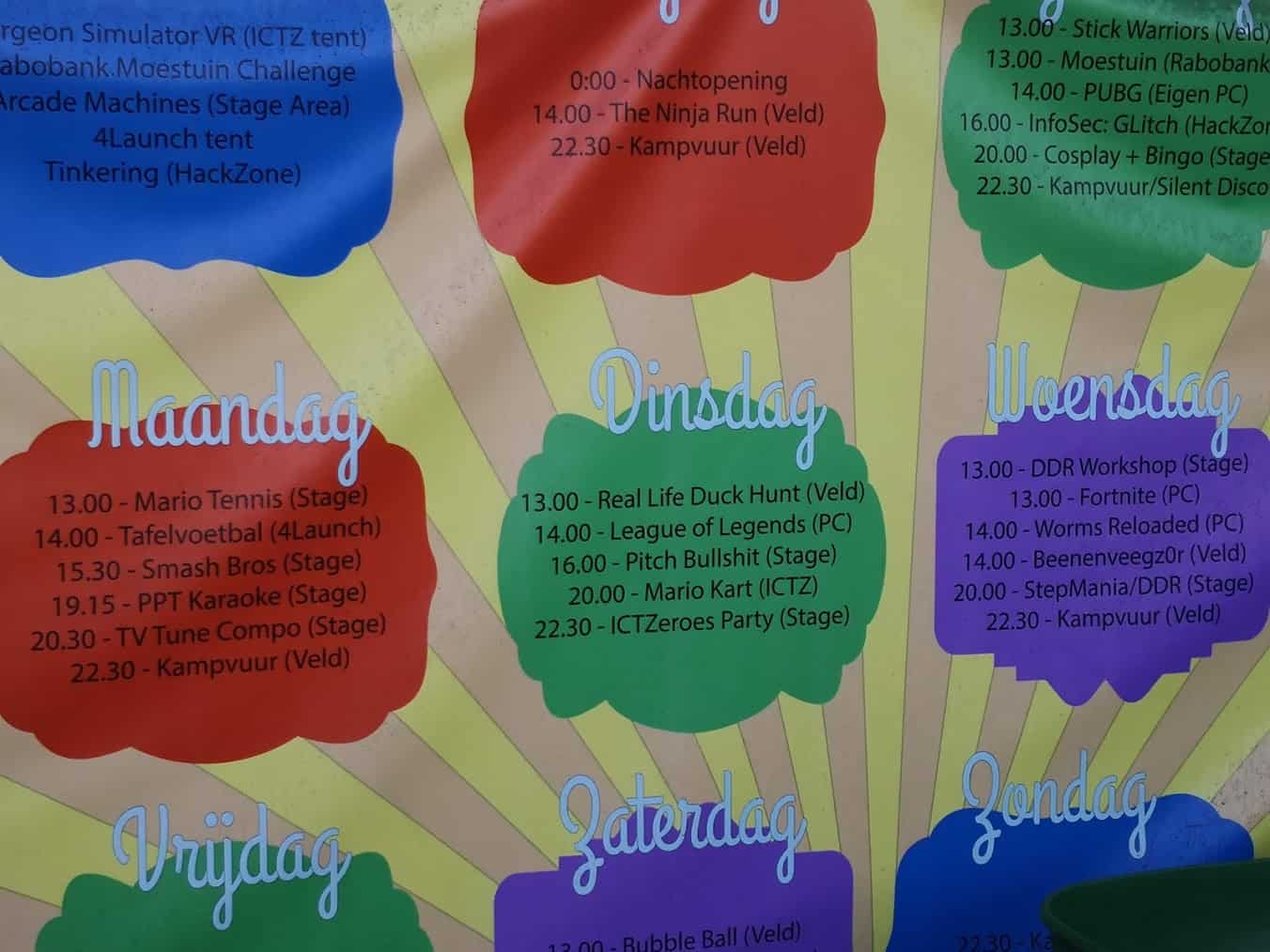 Er zijn overigens nog een heleboel andere dingen te doen, zoals bij de tenten van de sponsoren die zeker een bezoekje waard zijn. Ook is er iedere dag een agenda waarop activiteiten vermeld staan. Wij hebben enorm genoten van Live Duck Hunt, waarbij je buiten op een gigantisch “scherm” op “eenden kon schieten”. De dag erna was er een soort “wipe-out” baan, dus denk maar niet dat gamers nooit bewegen 😉