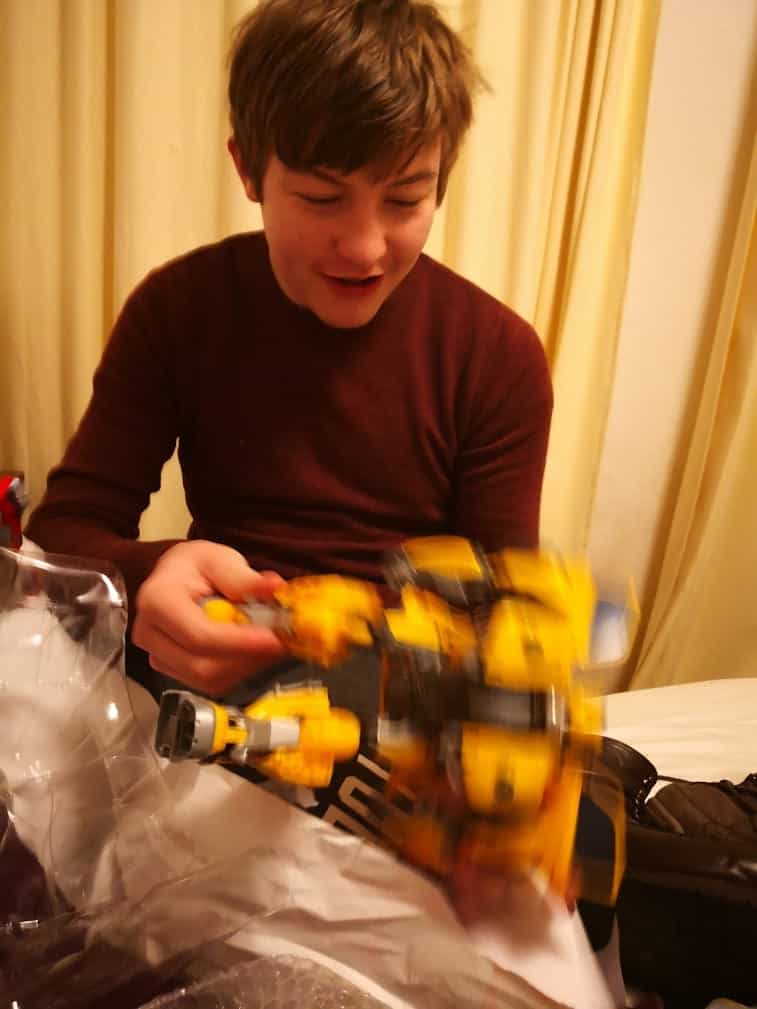 Ik had al wel van Transformers gehoord, mijn oudste zoon heeft een paar kleine Transformers en die zitten erg vernuftig in elkaar, maar ik wist niet dat er ook Transformers van dit formaat waren! Mijn jongste zoon kennelijk ook niet, maar hij herkende het grote pakket direct als Transformer.